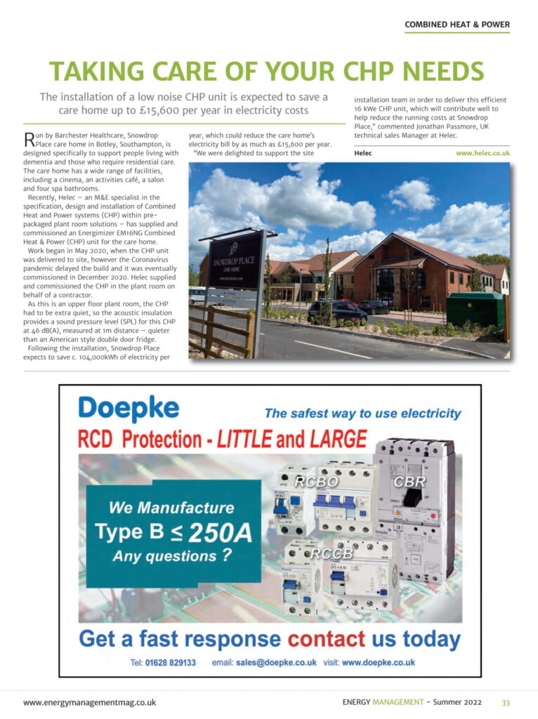 Helec has supplied and commissioned an Energimizer EM16NG Combined Heat & Power (CHP) unit at Barchester Healthcare’s Snowdrop Place care home in Botley, Southampton.