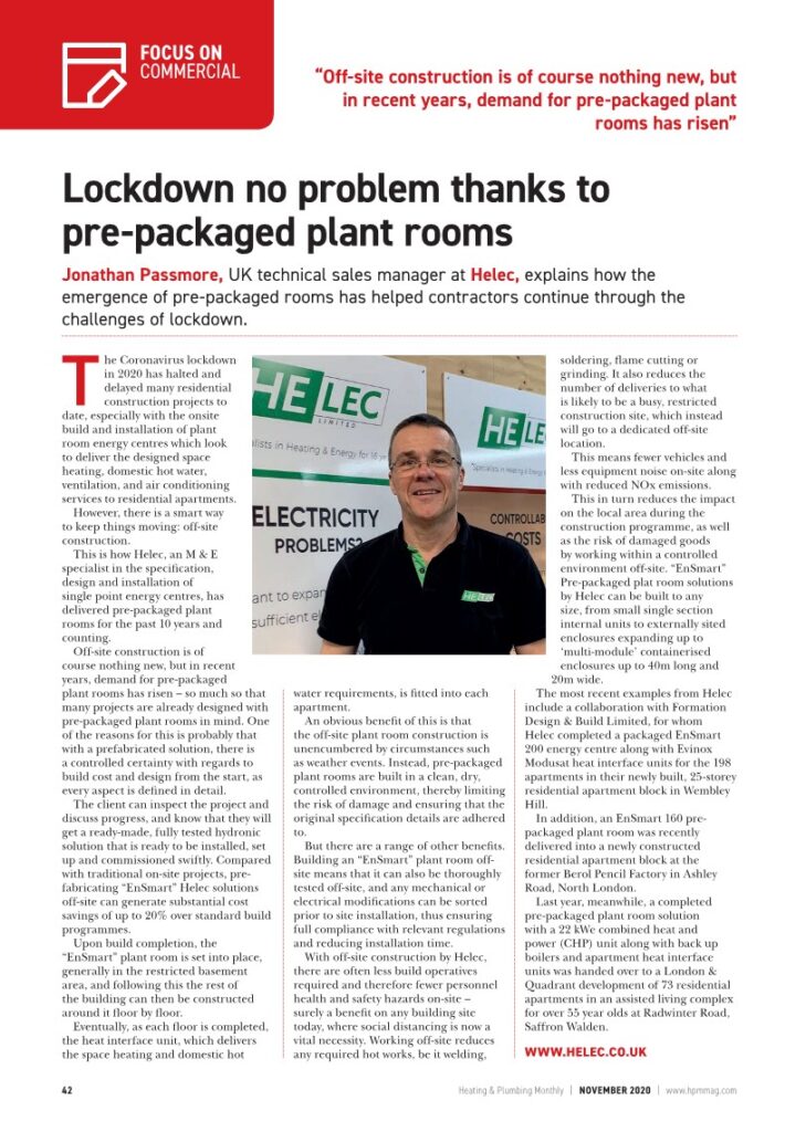 HVP News Sept 2020 Article showcasing Helec EnSmart Pre-Packaged Plant Room