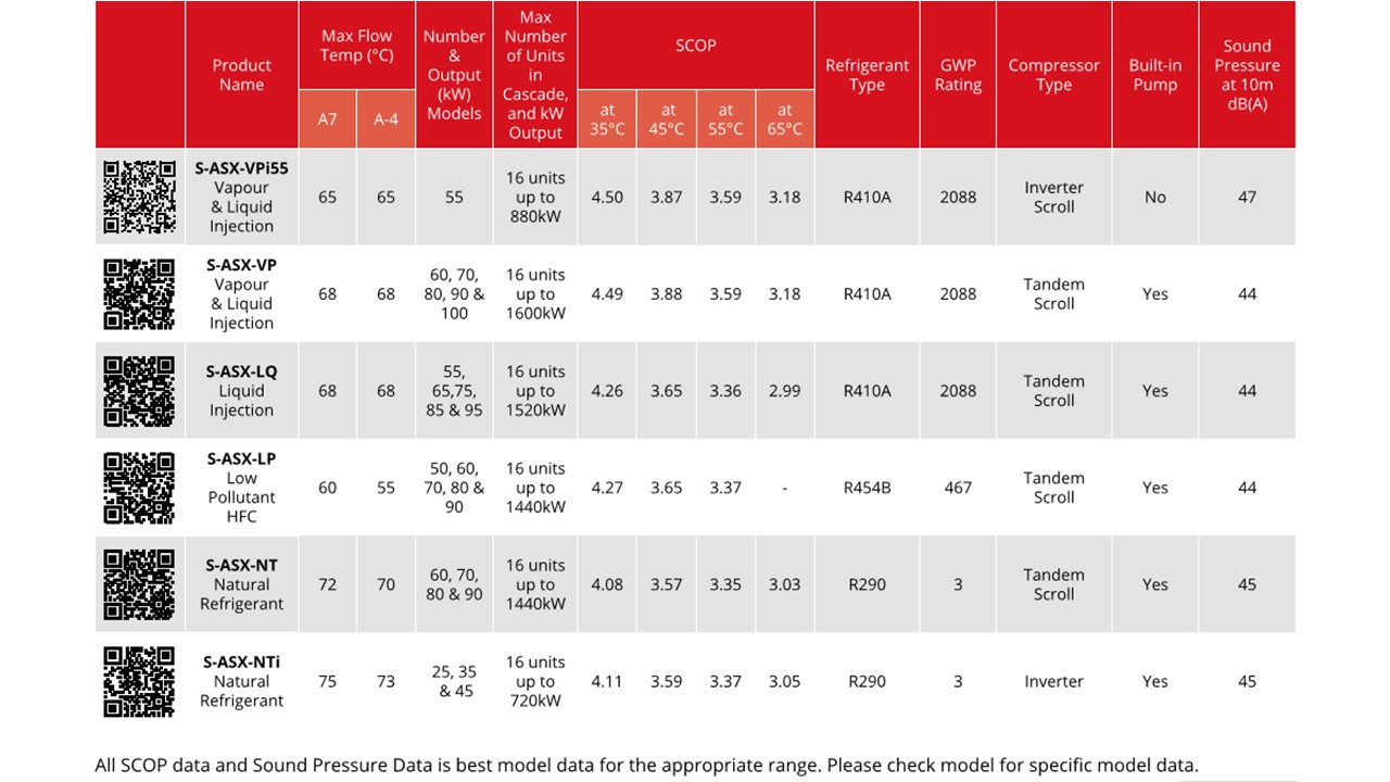 The S-ASX-LP range can deliver outputs up to 60°C in operating conditions down to ambient air temperature of 5°C. If a higher output temperature is required, then the S-ASX-VP (Vapour Injection) unit is available which can deliver outlet heat of up to 68°C down to ambient air temperatures of -20°C.