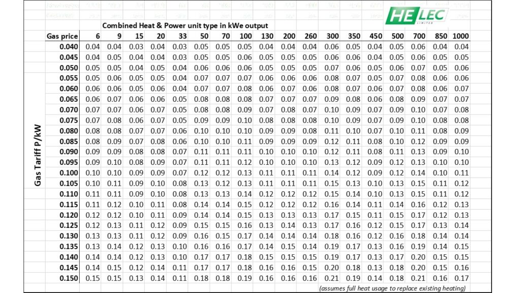 Simply scroll down the left side to the gas tariff amount you get charged, then run across to the nearest power output your site uses per hour to show you what the price to generate yourself will cost.