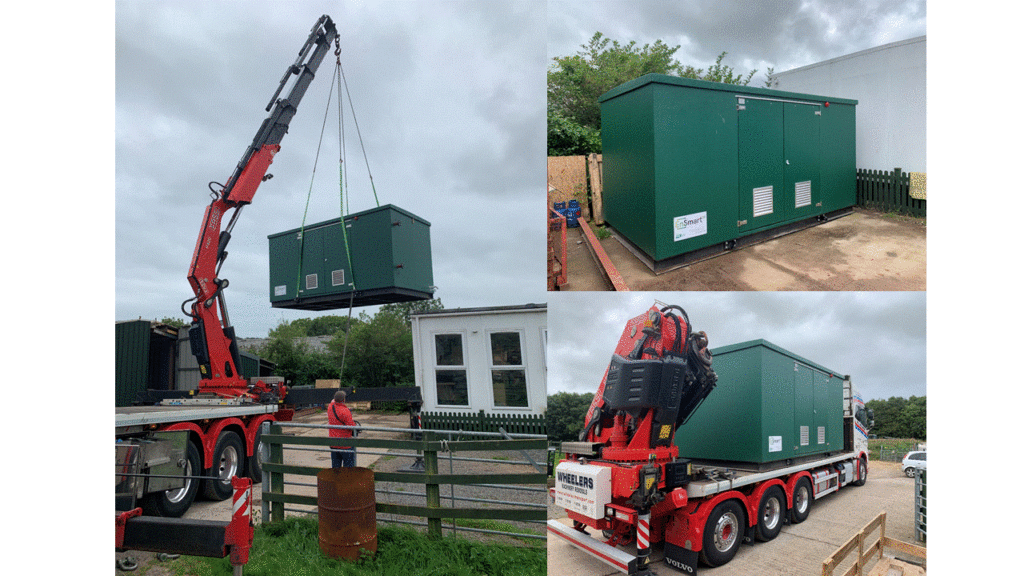 The completed off site construction of a containerised packaged plant room set within a GRP enclosure gets ‘very carefully’ lifted onto the Wheelers transport vehicle before it’s final onward journey to a Leisure Centre in Wickford, Essex.